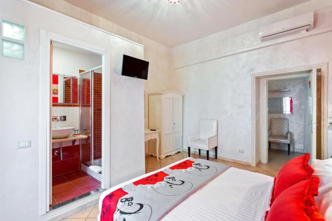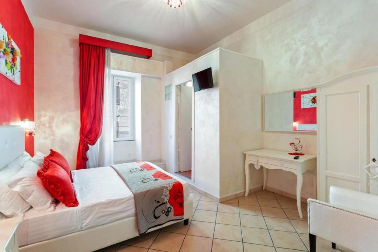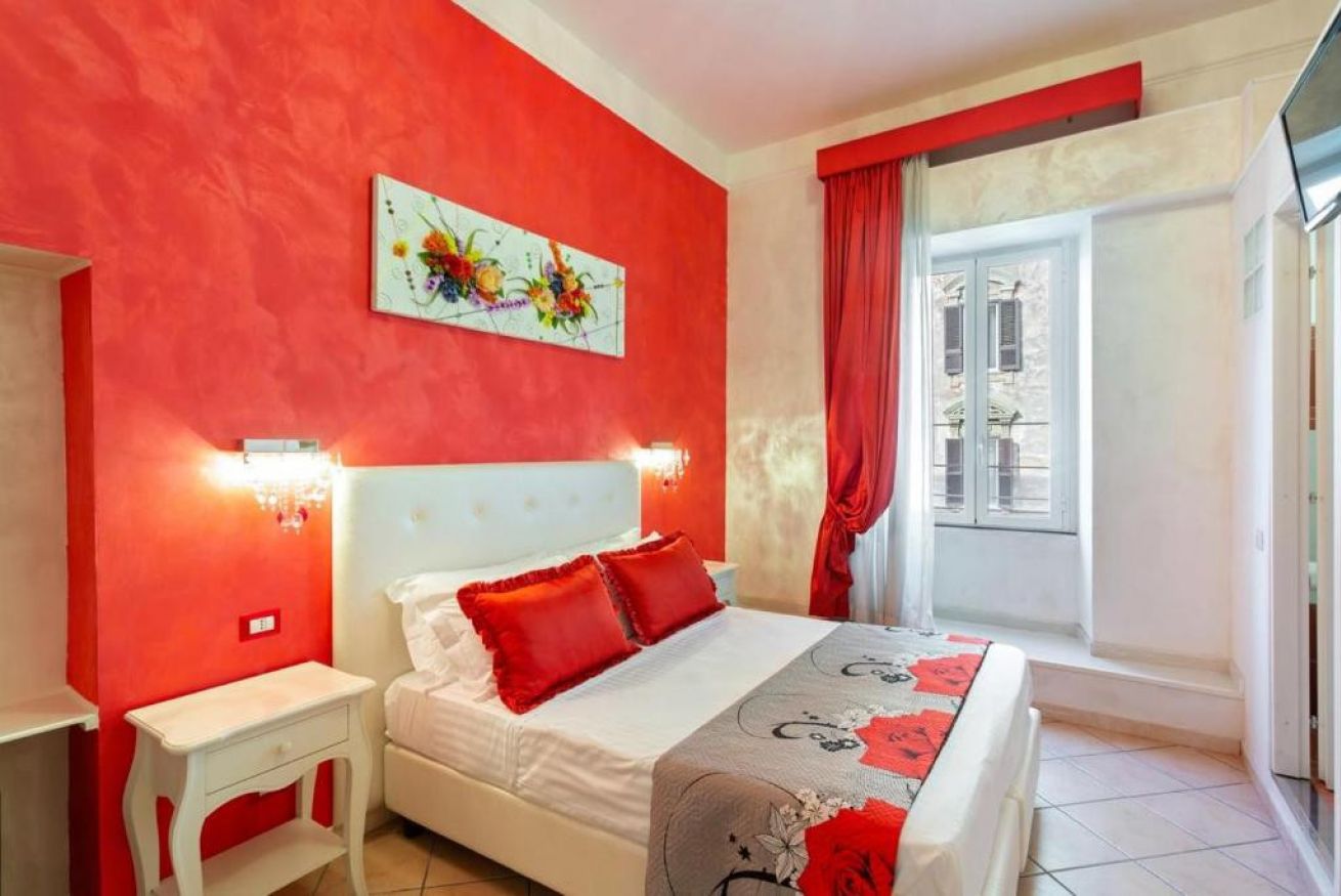 La camera Double Deluxe Rouge, per due persone nel centro di Roma è un rifugio di lusso e comfort. Con sfondi rossi di design, crea un'atmosfera vibrante e accogliente. Offre un ambiente elegante e moderno, completo di tutti i comfort, tra cui letti king-size, lenzuola di alta qualità e un bagno privato con doccia. Soggiorna e immergiti nel cuore pulsante della Città Eterna!